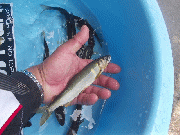 昨日の釣果、亀の甲橋下流で小林直樹さんが23匹、12から18センチ。他の場所では、速見さんが午前9時〜午後1時33匹、14から18センチの釣果。