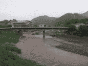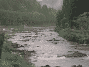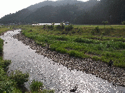 午後から夕立あり、山国・弓削地区が強かったようで、平水より20センチ高、減水から50センチ高、漁協前。