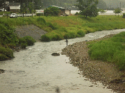 弓削川より急激な増水、赤濁り、漁協前、減水が10センチ高。