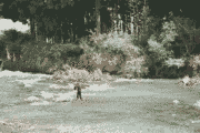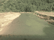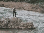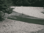 調子よく川へ車を下ろさないように。また、釣りも滑らないように。