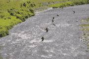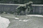 周山大橋から下を見ると垢の残っているところと白っぽくとんでいる筋が分かります。