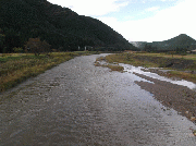 昨夜の雨で平水より約60センチ高、濁りあり。