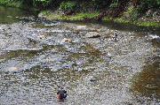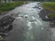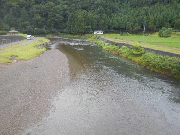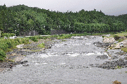 午前7時30分、漁協前、薄い笹濁り、六ケから下流の支流から薄く濁っているのが本流へ。友釣り可能な濁りです。