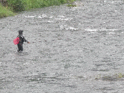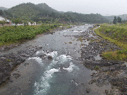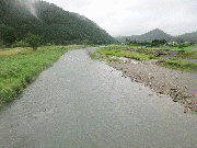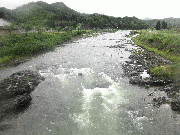 午後6時水位、上黒田 1.91m 周山 0.82m 中地 1.08m 五本松 0.37m 平水より約45センチ高、薄い笹濁り。朝から約15センチアップしています。明日は、これ以上増水すると不可能です。今の水位が川幅の広いところで上流部でどうにかです。