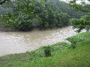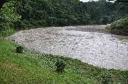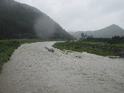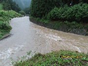 午後4時30分、朝から水位が上がり漁協前約1.3メートル高、友釣りは、明日、明後日も不可能。金曜日も微妙です。上流部ぐらいか?