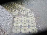 交流の森・広河原下之町付近の工事後は、穴あきブロックや斜面を下りるときに滑りやすく危険なところがありますので気を付けてください。