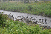 午後5時、水位、上黒田 1.61m 周山 0.28m 中地 0.46m 五本松 -0.01m 午後からレインコートが必要になってきました。小雨降ったりやんだり。10センチ弱の減水。