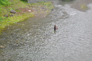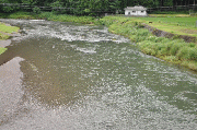交流の森で釣られている方は友釣り2匹の釣果。下畑おとり店付近は、平水より30から40センチ高。(写真3段目釣り人)