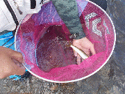 午前中、吊り橋で22匹。他潜没橋伏見の渡辺さん56匹、14から17センチ位。もう1人の方も近くで40匹以上の釣果。