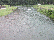 [内容] 午前6時現在、漁協下で水位、約50センチ高、山国30から40センチセンチ高、濁り山国地区までほとんど無し。周山は、弓削川の水量がある分高いです。