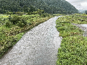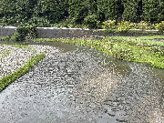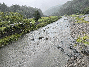 午後3時頃から一時的に強い雨が降りました。その影響か、谷や支流から濁り水が出てきています。水位も少し上がってきているようで、漁協下では平水時の約10cm高。
