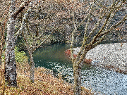 冬の時期、流れの緩い淵などに溜まったハエ等の雑魚がカワウの襲撃を受けます。このため、秋から鮎の解禁まで河川各所にカワウ除けのテグスを張り巡らせております。