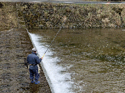 冬の時期、流れの緩い淵などに溜まったハエ等の雑魚がカワウの襲撃を受けます。このため、秋から鮎の解禁まで河川各所にカワウ除けのテグスを張り巡らせております。