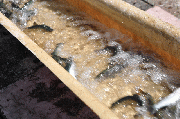 冬の時期、流れの緩い淵などに溜まったハエ等の雑魚がカワウの襲撃を受けます。このため、秋から鮎の解禁まで河川各所にカワウ除けのテグスを張り巡らせております。