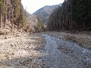 砂防堰から数百メートル上流からは大きな被害としては無いと思われます。(重機入川道)