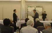 写真1は、京都府(山田知事)水産課長へ要望書の提出(中村副会長)。写真2は、情報交換会議。(河川工事、環境・ダムの影響・カワウ・外来魚等)