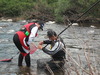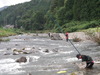 京都府ゼミナールハウスの1泊2日コースの教室が午前中開催されました。 多い人で9匹、少ない人で3匹の釣果。 女性の方で初めての体験、貸しウエダが暑く、素足で入っておられました。(写真、6匹釣られたとか) 女性の素足は、良く釣れるのかな。一度お試しを。まむしに注意して下さい。 解禁から、苦情の電話をいただいていました方、初めての人でも釣れています。友釣りの醍醐味を味わえないとかの苦情の方も、場所を見るのも釣りの内と言われていました。 場所で当たりはずれもあると思いますが、外れたらあきらめて下さい。移動するか次に期待して下さい。 講師も、女性の方のところに集中しているように見えます。 |