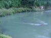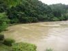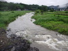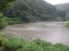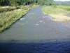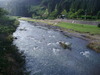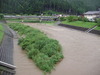 午後6時の水位、上黒田 2.17m 周山 1.15m 中地1.44m 五本松 0.68m 漁協前で朝から5から10センチ引いた程度です。花背上流で30分の強い夕立有り、水位が上がり濁りが赤濁りになったそうです。細野川も谷の崩れた影響と思われますが濁りがとれません。明日も不可能。写真最終漁協前午後6時です。 |