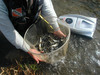 正午現在、灰屋口から下流入川者無し。水位が下がらなく、おとりが入りません。午後からも無理です。