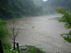 午前8時、漁協下で平水より約1.5メートル程度増水しています。昨夜は、一時2メートル近く増水しました。 正午、漁協下で1メートル以上高く茶色です。 明日の友釣りも難しい状況。 午後1時細野川芦見谷付近笹濁りで竿を出しておられる様です。花背も茶色の濁り。